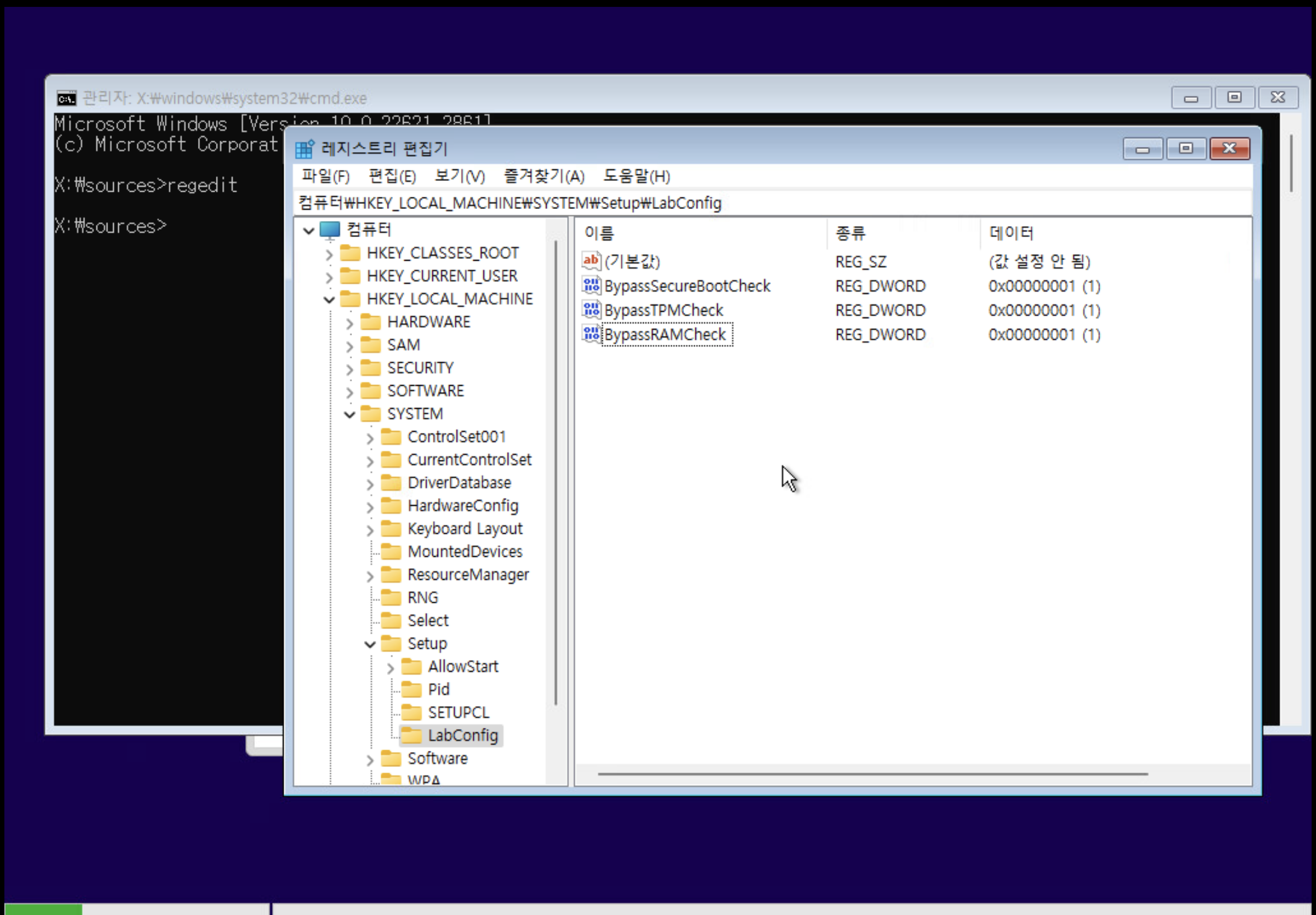 Shift + F10 > regedit > HKEY_LOCAL_MACHINE > SYSTEM > Setup > LabConfig 키 생성